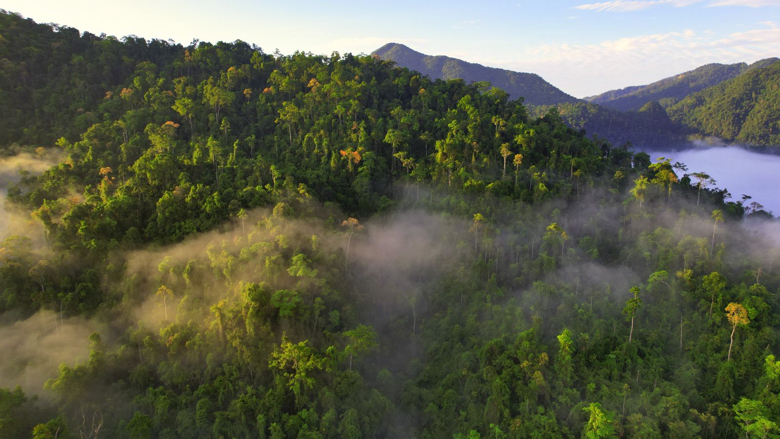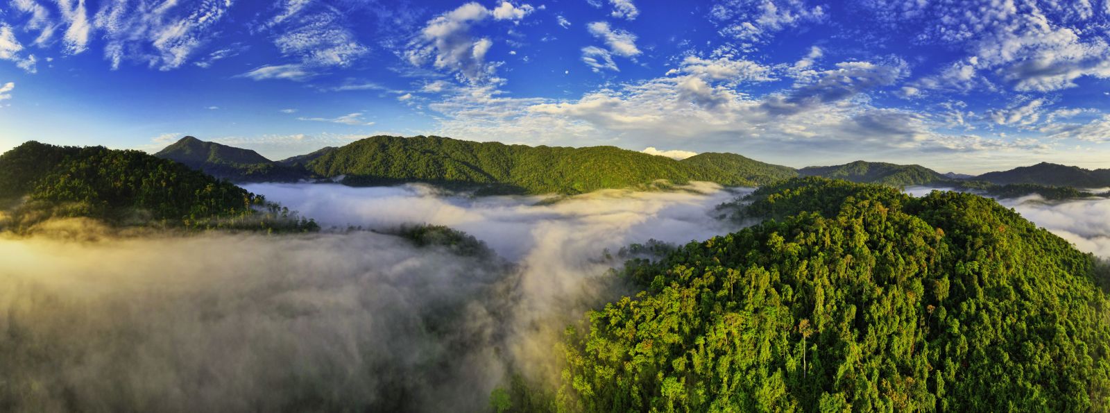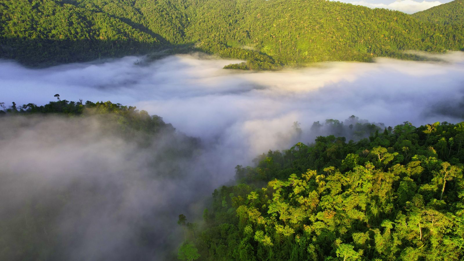 The sea of clouds is gradually scattered as the sun is high, and far to the right is the scaphium macropodum forest bearing fruit