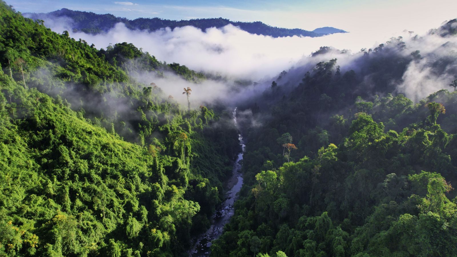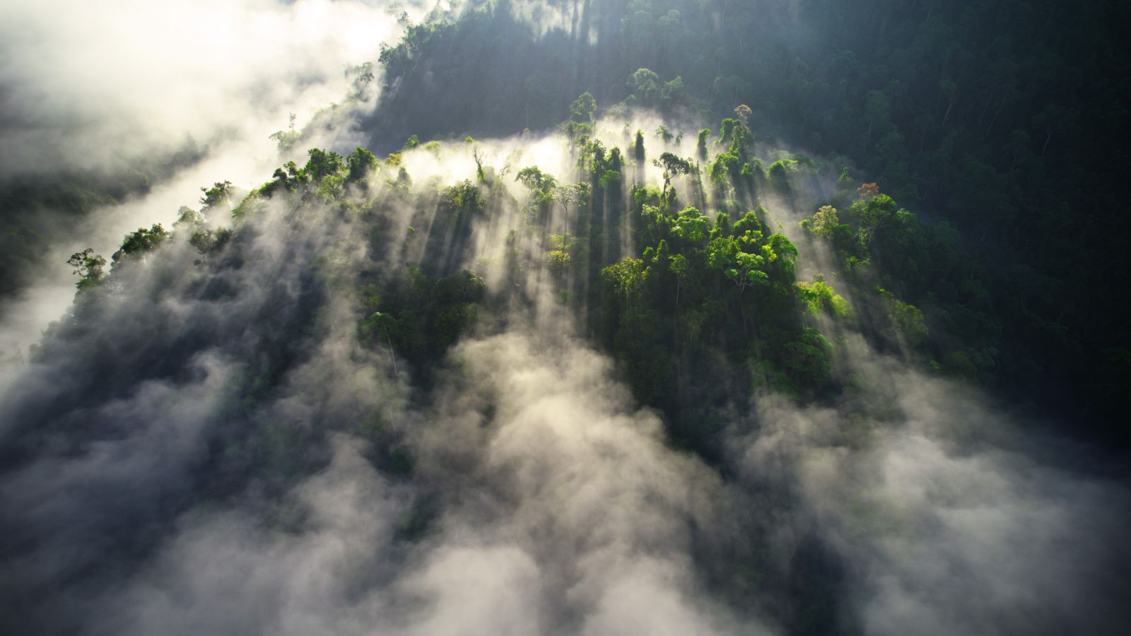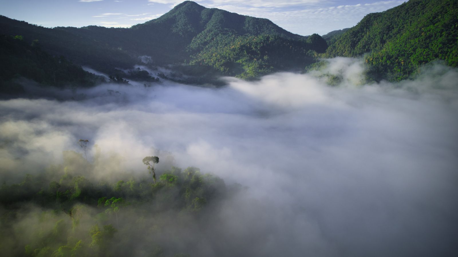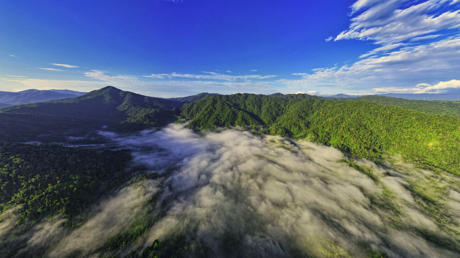 The sea of clouds is gradually scattered as the sun is high, and far to the right is the scaphium macropodum forest bearing fruit