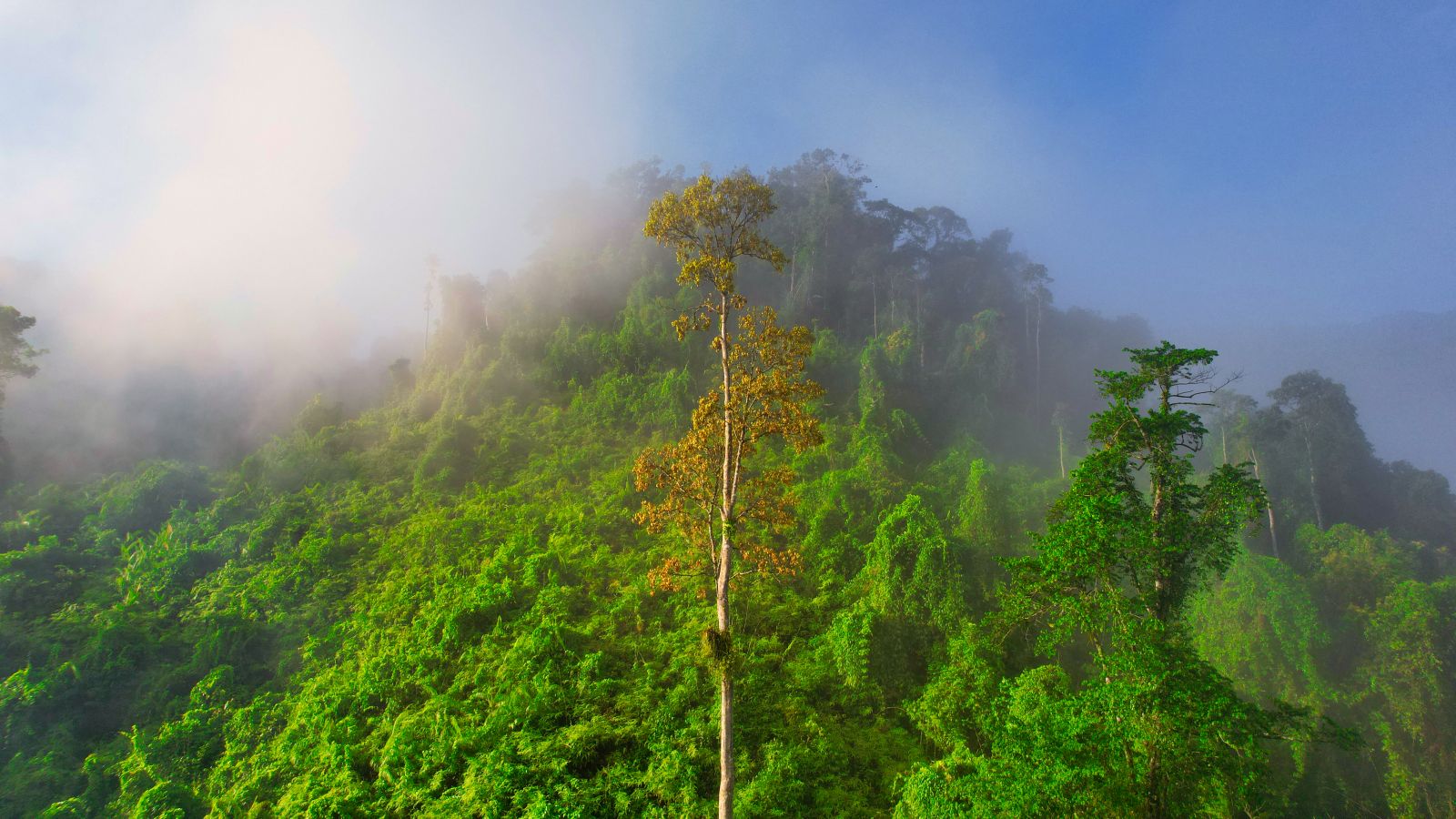 A mountaintop is covered by morning dew, and the orange dots are the scaphium macropodum trees in the harvest season