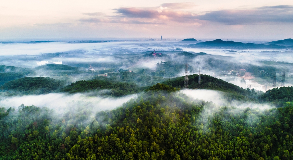 The mountains and hills are dim in the dew like in the fairy land