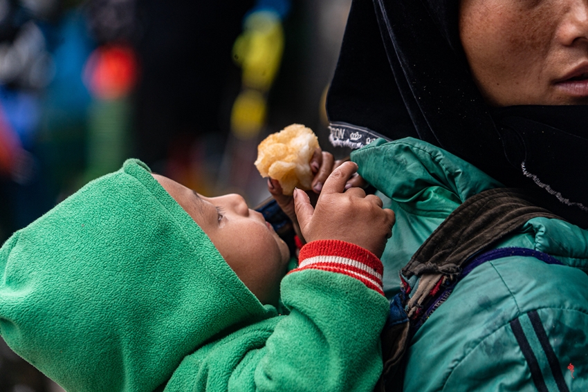 | A Dao ethnic grandmother carrying her grandchild in a trinh tuong house, beside the market |
