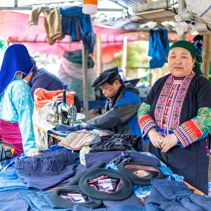 | A H'Mong ethnic family, with the husband sit sewing while the wife selling ethnic minority clothes to the locals |