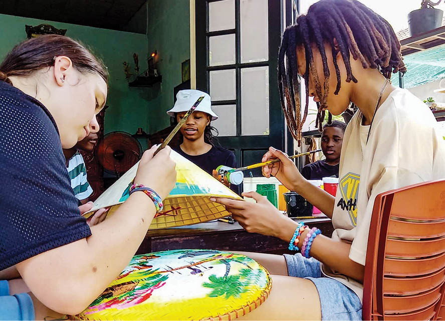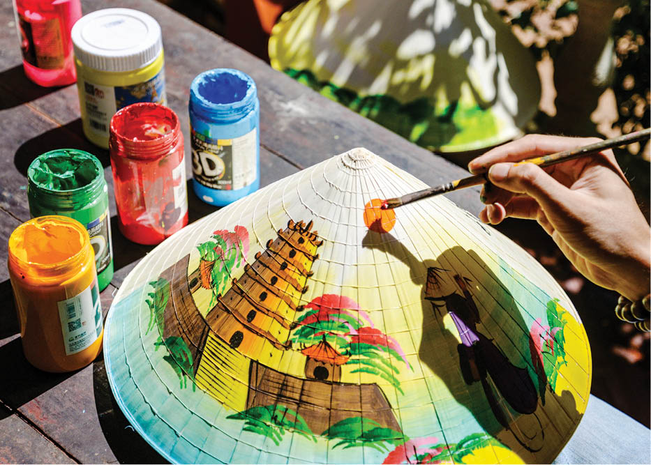 The conical hats painted by Nhat, with motifs of the homeland, the country, and scenic spots of Hue, are very popular with visitors. Therefore, when they want to experience painting on conical hats, he is really prepared. Thanks to that, his home space is always bustling with laughter whenever there are visitors.
