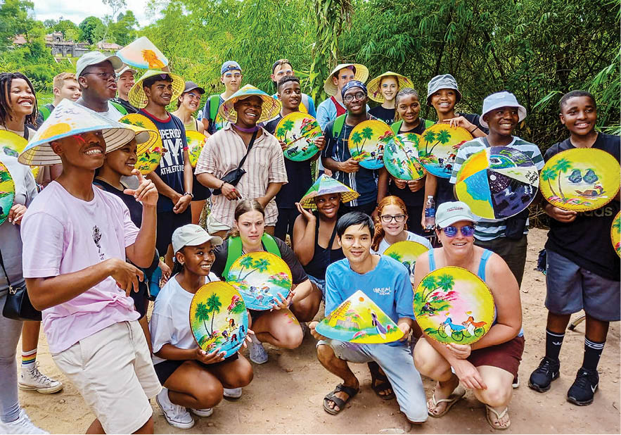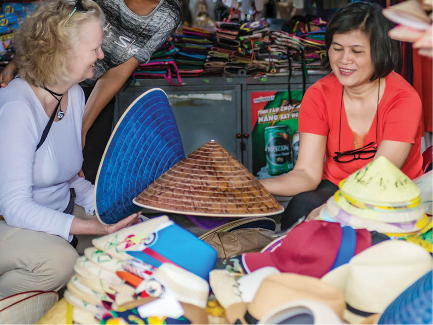 Foreign visitors are practicing painting on the conical hats