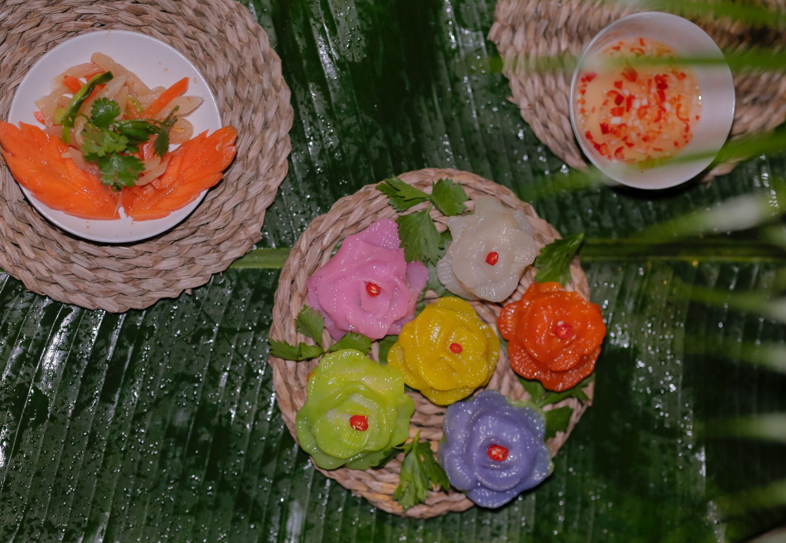 Rose-shaped dumplings are served with Hue style sweet and sour fish sauce.