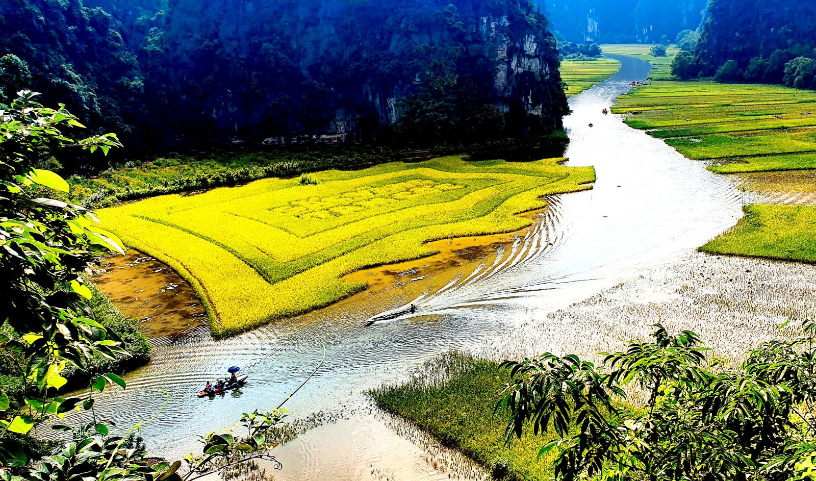 The festival flag is a masterpiece of the nature as seen from above. It becomes even more prominent as lying along the Ngo Dong River. The unique creation in the Tam Coc rice field adds unique beauty, and a difference to the most beautiful ripe golden rice field in Vietnam.