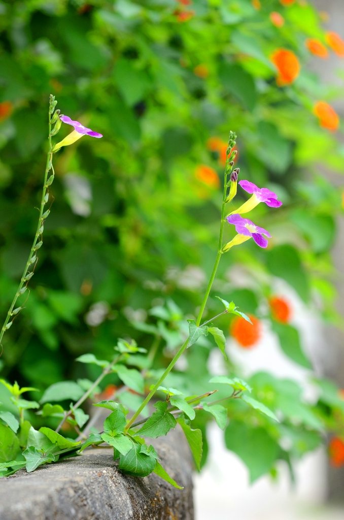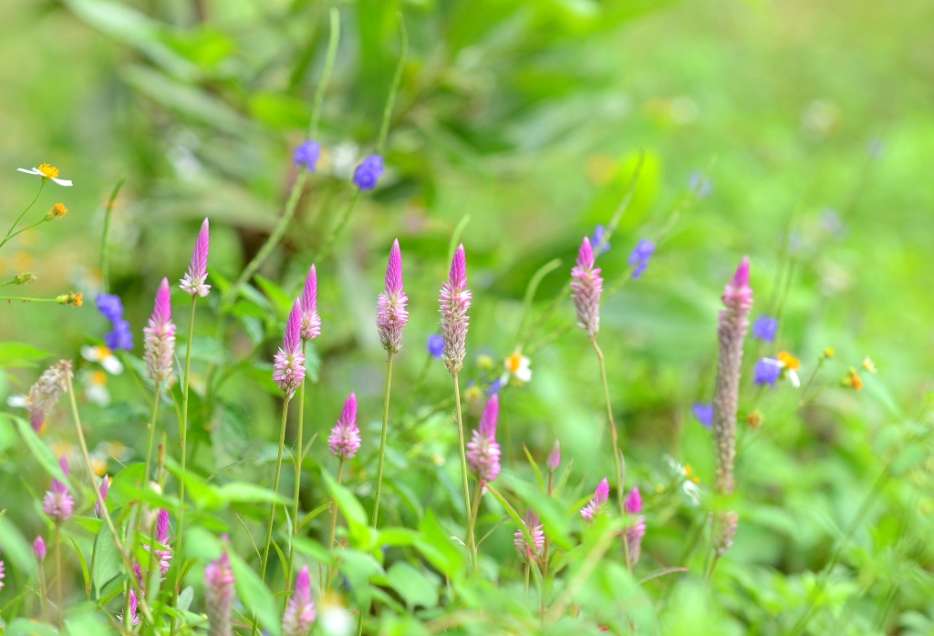 Without being well-tended, wildflowers are still in natural blossoms and pleasant fragrance. Unlike the regal and mannered roses or orchids, the wildflowers are fragile but not weak, arrogantly rising in the sun, in the wind and between carefree human steps.
