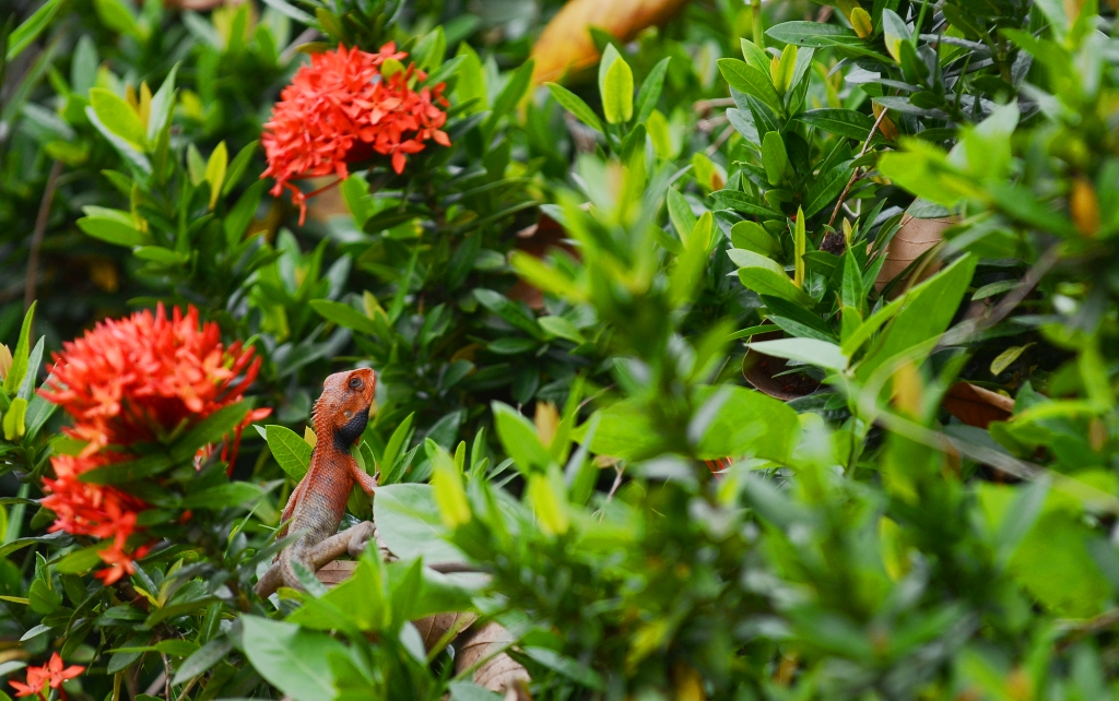 A gecko is "competing" its colors with West Indian Jasmine, a kind of “sweet drink” in many people’s childhood