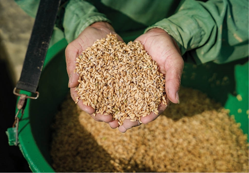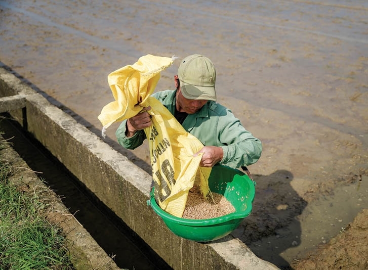 | Mr. Le Van Son (a resident of Hoa Chau Ward) is sowing rice seeds in Thanh Phuoc fields |