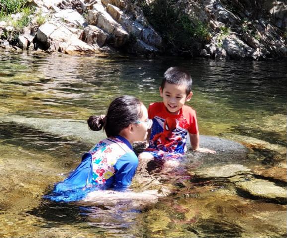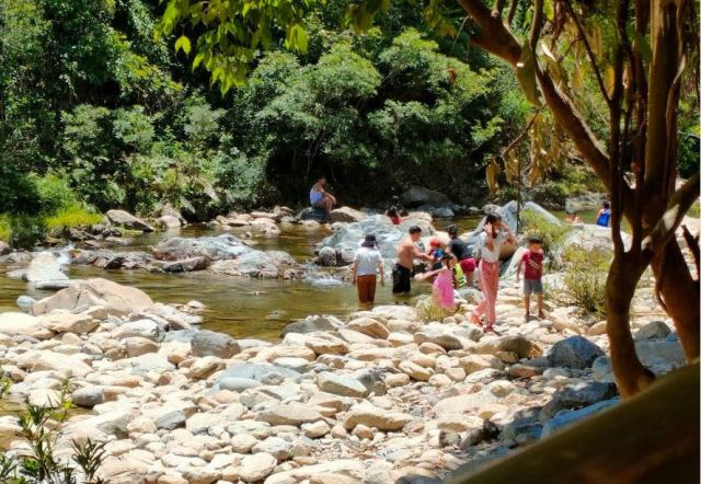 There are people sitting in the huts, peacefully listening to the sound of the stream with children playing and swimming, sometimes splashing water on each other with great pleasure. Sometimes they unintentionally smiled very lightly when caught sight of a young girl sitting on a stone in the middle of the stream, posing for picture with a pretty umbrella, which made the stream look youthful.