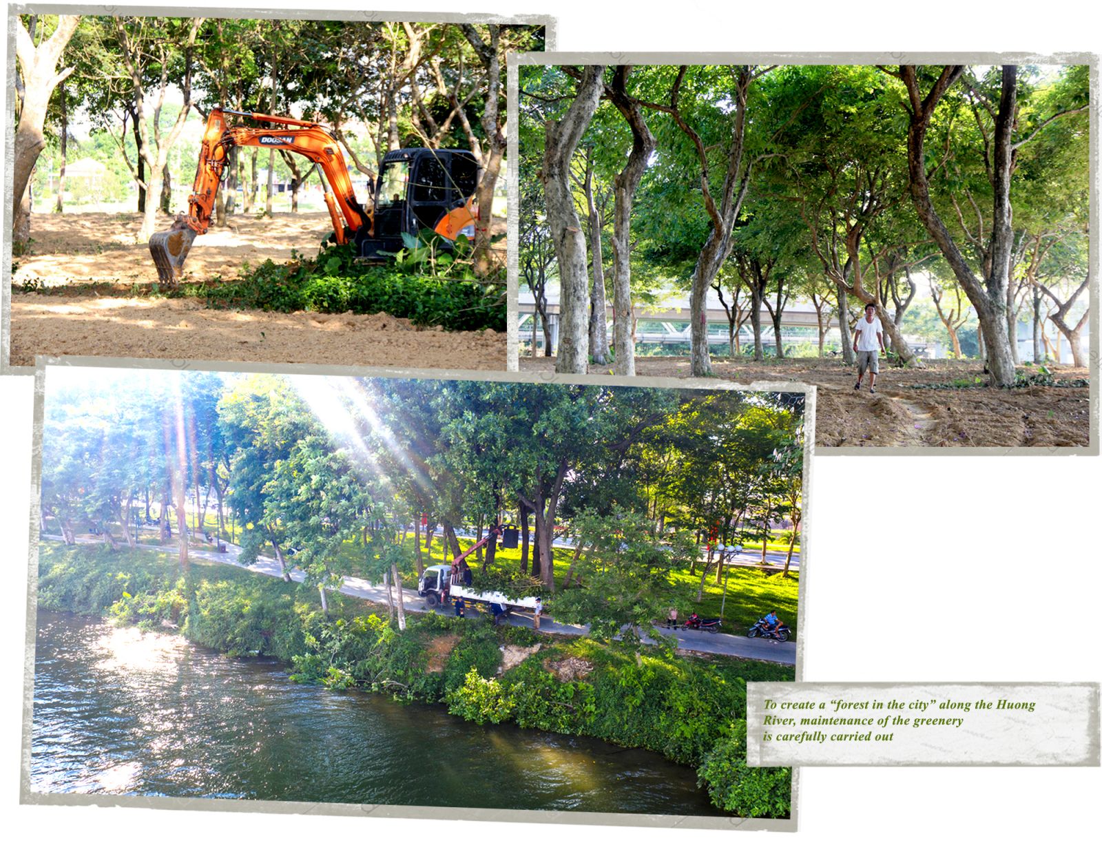 Another equally important task is the pruning of trees to create the perfect beauty for the paths along the Huong River. This pruning is based on the principle of 4m from the roots upwards, which not only keeps the green "forest in the city" but also creates a spacious feel. Pedestrians can see the river and people travelling on the river can look through the trees to clearly see the dynamic city...