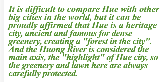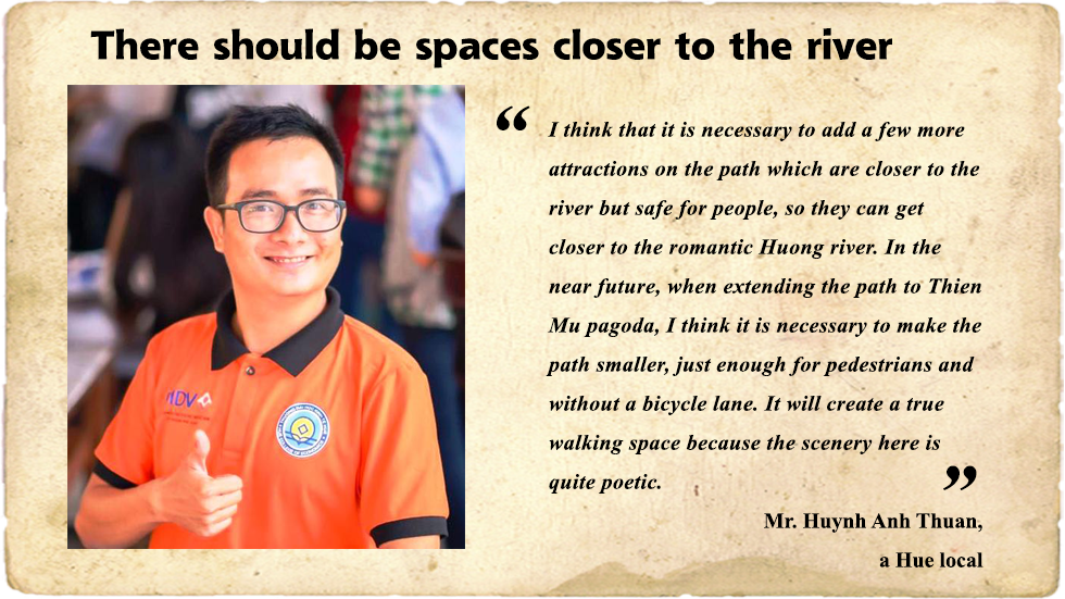 Mr. Le Nhu Chinh, Director of Hue Green Park Center stated that the Huong River running through the city center with the system of green trees and lawns has given Hue a unique beauty, unlike other rivers in the world. Therefore, the process of renovating and embellishing roads along the Huong River is not a difficult task, which just requires a respect for nature. “The existing trail is available. If we need to expand, then we can expand. We should minimize cutting down big trees and instead, plant more flowers to decorate the space on the banks of the already beautiful Huong river to make it even more attractive,” Mr. Chinh shared.