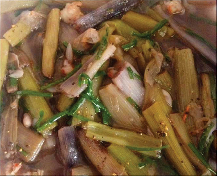 After taking some glasses of beer, he revealed: "This is water lily stalk stir-fried with shrimp. They are all from the Con field.  At this time of the year, fields are full of water lilies; shrimps are caught naturally from the river. Is it yummy?" Trying for the first time the strange food made from a familiar kind of flower in the native village, along with his recommendation, I found it so delicious. Soon we finished the bowl. My friend quickly brought up another dish. This time it was water lily stir-fried with fish. "This morning while picking the flowers, I happened to see these two snakeheads in the field." From the same kind of flower and by the same cook but while water lily stalk with shrimp tasted sweet, water lily stalk with fish tasted like sour soup. The truth was that whether cooked with shrimp or fish, the fatty and crispy taste of water lily stalk was a real treat.