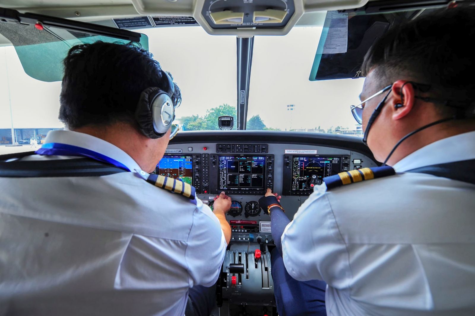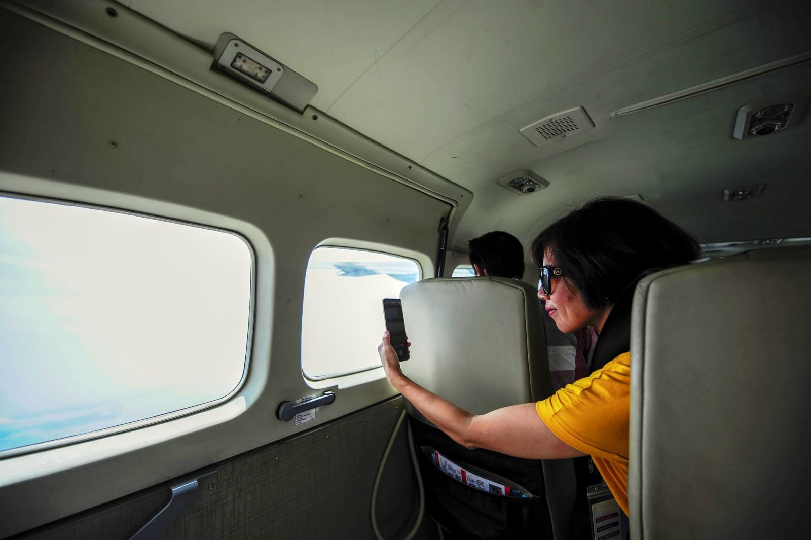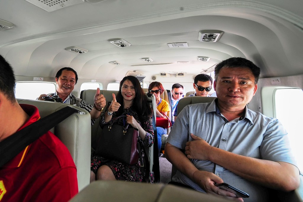 The first passengers pose for a photo with the Cessna Grand Caravan 208B-EX aircraft