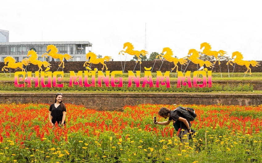 | Tourists checking in the spring flower garden when travelling to Hue |