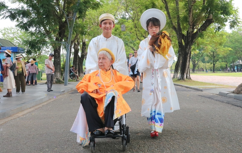 Among the many guests we had the opportunity to talk to, the most impressive one was Mrs. Huynh Thi Kim (85 years old, from Ho Chi Minh City). In a wheelchair pushed by her children and grandchildren to visit the Imperial City, she was still very humorous when talking about her trip. Mrs. Kim said: “I have a lover in Hue for nearly 10 years, but it was not until I was 85 years old when I was able to be here. Hue is very beautiful, the people are lovely and the scenery is lovely, not noisy or rushed.”