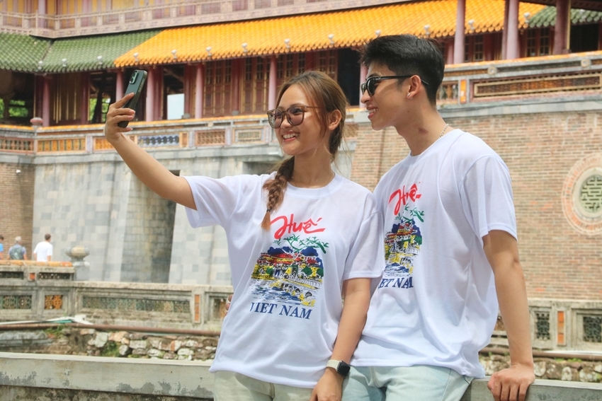 | A young couple from outside the province wearing Hue souvenir shirts to capture beautiful moments when traveling to the Ancient Capital |