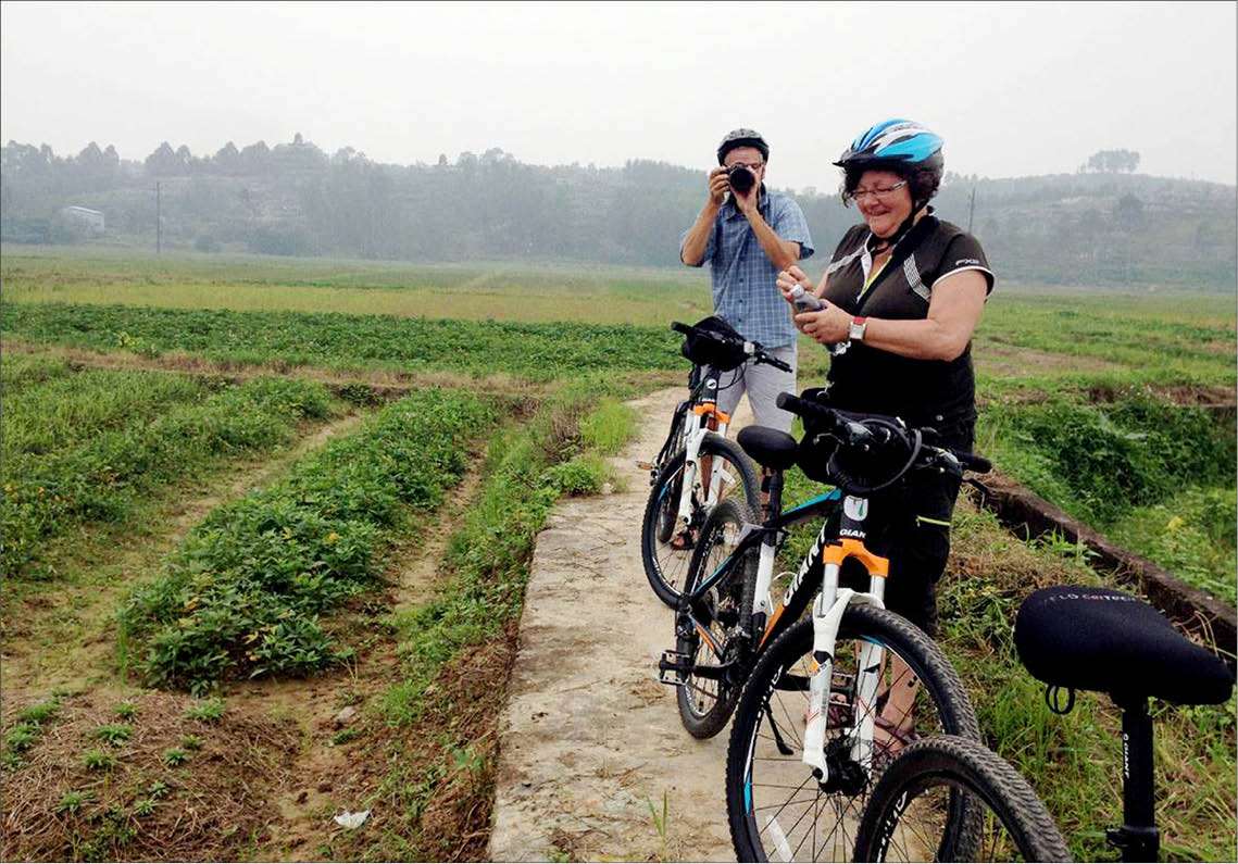 Tourists, when cycling along NH 49B, go through the fields, do sightseeing and experience farming