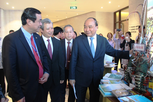 Prime Minister Nguyen Xuan Phuc (first from right) and delegates visit exhibition booths on the sidelines of the conference Photo: Phan Thanh