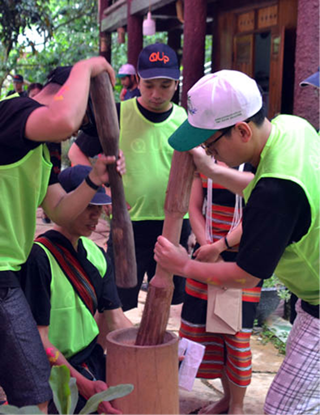 Our first challenge was to take part in a game of pounding rice with a pestle and a wooden mortar, which is a preserved typical daily activity of Pa Co people in A Luoi. While the young men used the strength of their muscles to pound rice, the girls made A Quat cakes with skillful hands under the guidance of the Pa Co mothers and sisters. This is a typical cake of the Pa Co people, which is only presented at the banquet during important days.
