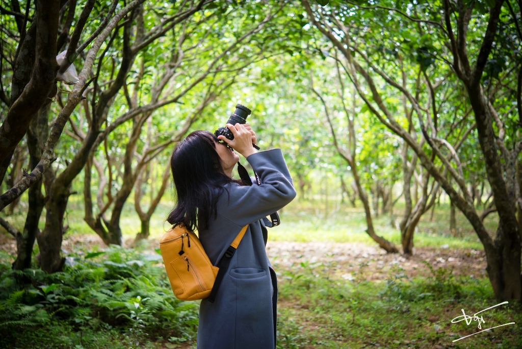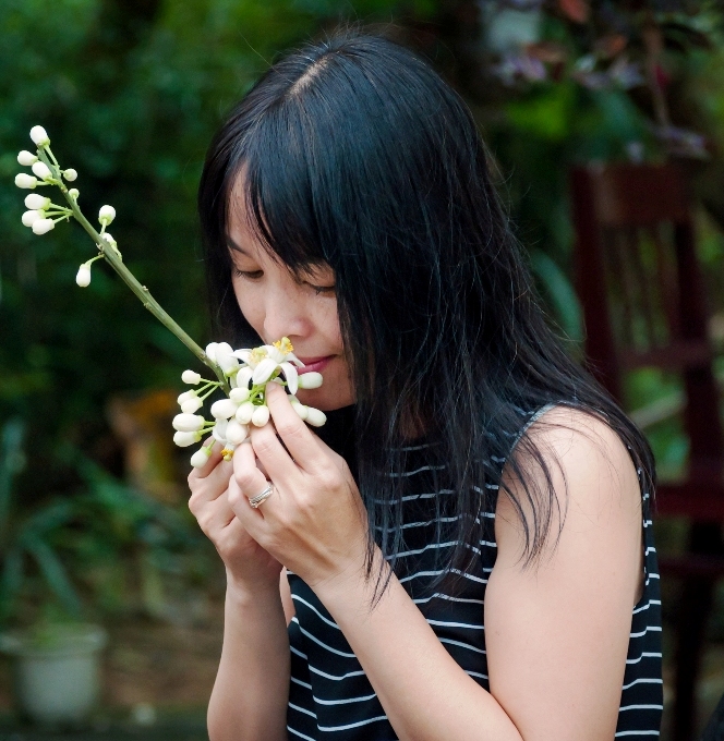 A visitor enjoys the fragrant atmosphere of grapefruit flowers