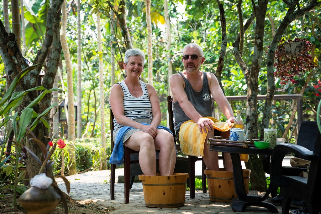 Foreign visitors enjoy soaking their feet in water with grapefruit oil, which helps dispel their tiredness