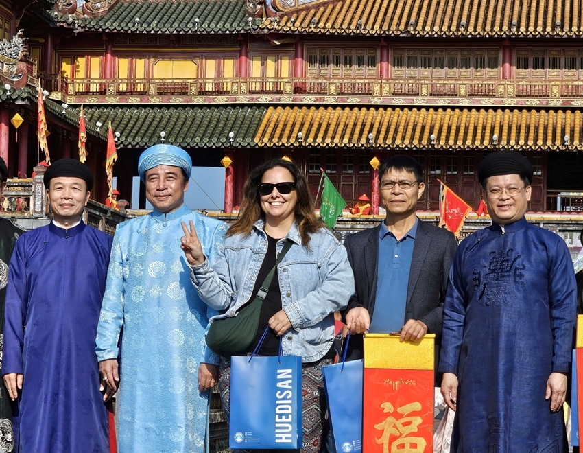 | Chairman of Hue City People’s Committee Nguyen Khac Toan (second, from left) and city leaders presenting gifts to visitors to Hue Imperial Citadel |