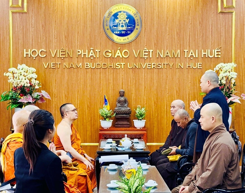 Venerable Thich Nguyen Thanh (Ph.D.) - Member of the Executive Council, Deputy Head of the Central Education Committee of the Vietnam Buddhist Sangha, Permanent Deputy Rector and Head of the Training Department of the Academy, and members of the Executive Council of the Vietnam Buddhist Academy in Hue welcomed and worked with the delegation.