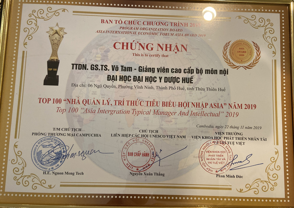 Certificate of People's Doctor, Prof. Dr. Vo Tam, Senior Lecturer in Internal Medicine, University of Medicine and Pharmacy, Hue University - Top 100 "Asia integration typical manager and intellectual" in 2019.