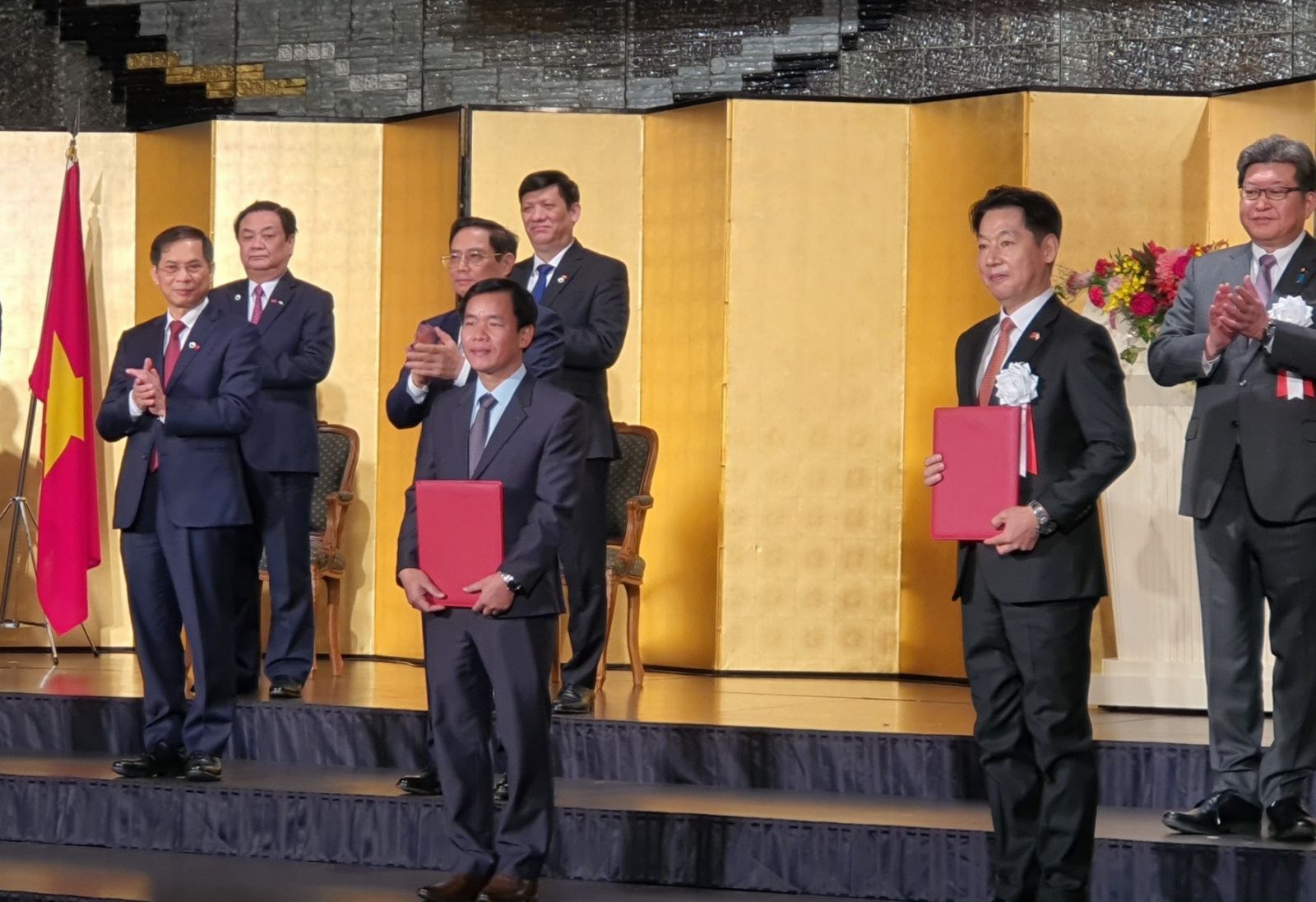 Chairman Nguyen Van Phuong (left) handing over the MOU with AEON MALL Vietnam Co., Ltd. under the witness of leaders of the two countries. Photo: Government Office